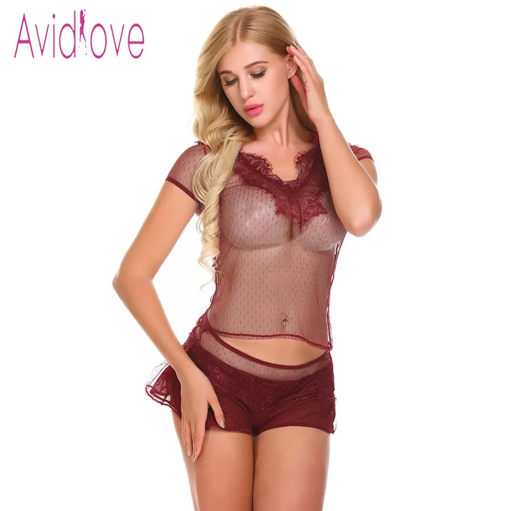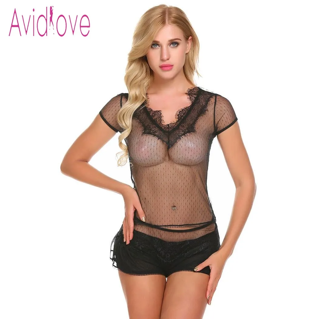 Good Chance for Avidlove 2018 New Lingerie Sexy Hot Erotic Underwear Women O Neck Cap Sleeve Lace See Through Pajam